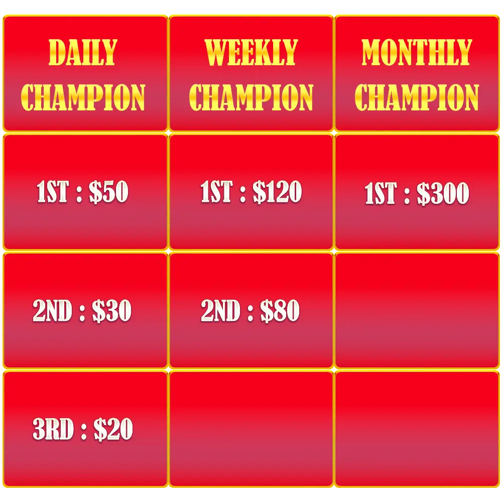 Daily Champion : Awarded to the top 3 players with highest winning points on the daily leaderboard.
